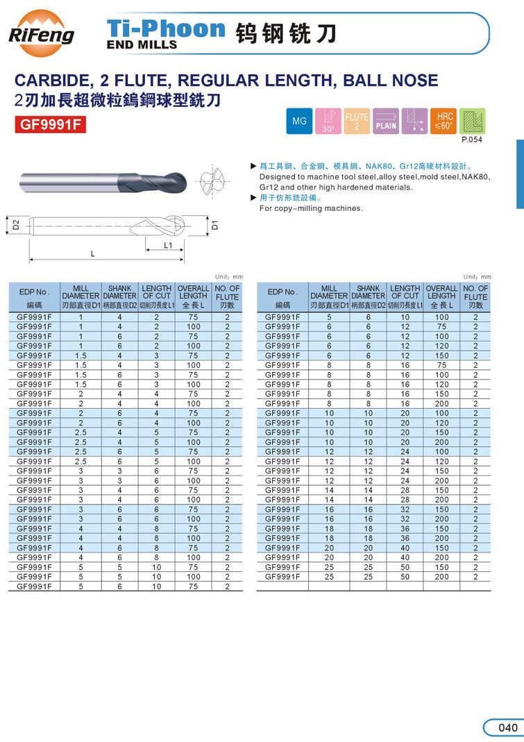 6. 2刃加長球型超微粒鎢鋼立銑刀040