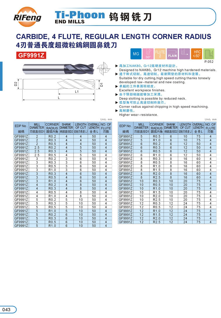 9. 4刃超微粒圓鼻鎢鋼立銑刀043